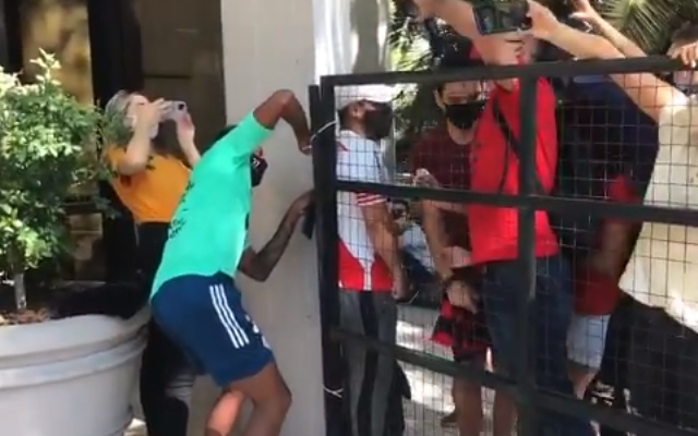 O Flamengo está na Argentina desde o último domingo (22), onde enfrenta o Racing, pela primeira partida das oitavas de final da Libertadores da América, neste terça-feira (24). Nesta segunda (23), um ano completado do bicampeonato da América, Bruno Henrique atendeu os fãs rubro-negros na saída do hotel e foi surpreendido com pedido inusitado de um torcedor argentino. O homem entregou uma caneta e pediu que o atacante autografasse uma camisa do River Plate. Nas redes sociais, o Flamengo registrou o momento.