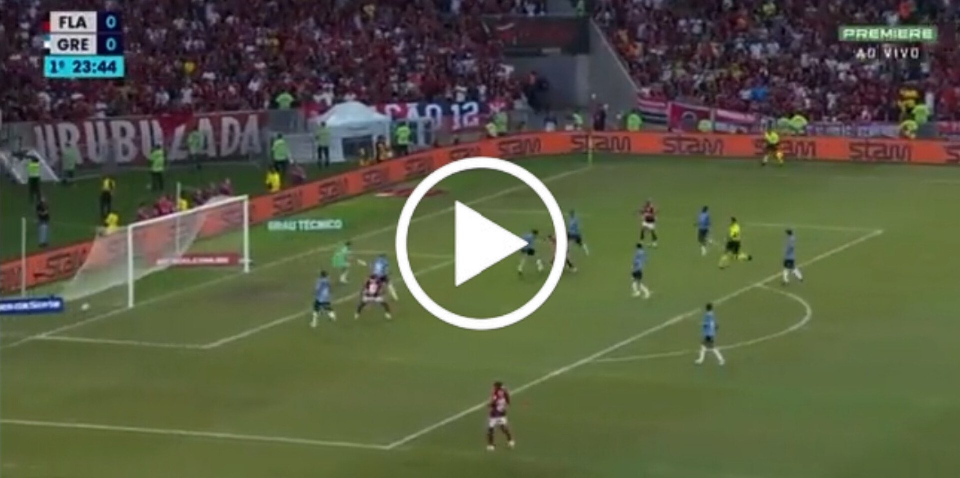 Aos 23 minutos do primeiro tempo, em jogada de Wesley na lateral-direita, Everton Cebolinha cercado por vários jogadores conseguiu finalizar e marcar o gol. Veja o lance abaixo: